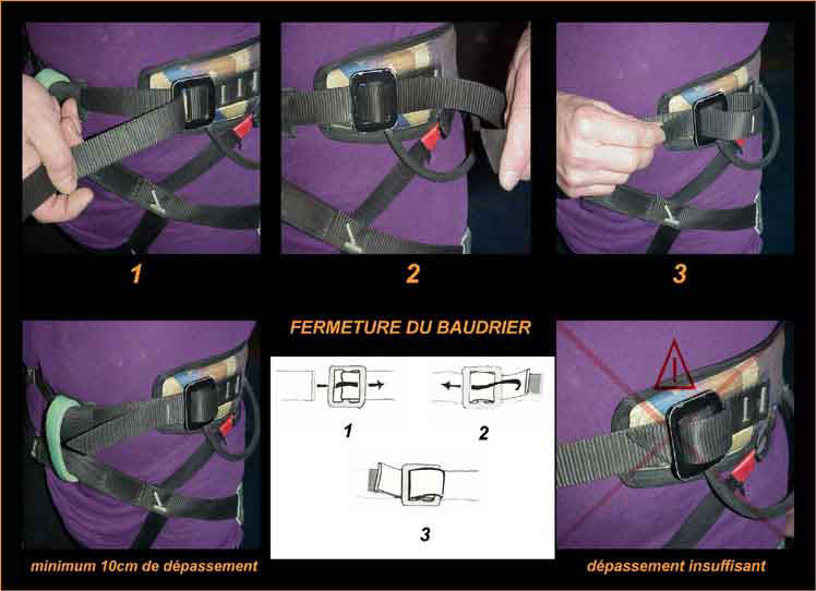 AVANT DE COMMENCER A GRIMPER, IL EST IMPERATIF DE VÉRIFIER QUE LA SANGLE DE CEINTURE DE VOTRE BAUDRIER EST BIEN FERMÉE :